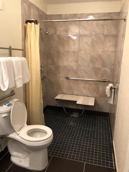 Room comes equipped with 1 King size bed, a roll in shower, raised handicap toilet, and a lowered accessible sink. Additional devices for the blind and hearing impaired are available at the front desk at no additional charge. Room Amenities